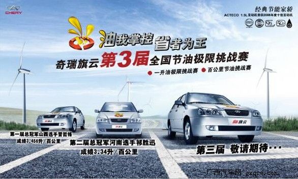 2010年3月中旬,奇瑞旗云第3屆節(jié)油極限挑戰(zhàn)賽將在全國(guó)范圍內(nèi)拉開帷幕。旗云節(jié)油挑戰(zhàn)賽自08年以來(lái),已圓滿舉辦兩屆,其規(guī)模之大,時(shí)間之長(zhǎng),在同行業(yè)節(jié)油賽中實(shí)屬罕見(jiàn),特別是大賽采用的外掛計(jì)量油箱,油耗多少一目了然,既科學(xué)又公正,以最真實(shí)的比賽方式讓消費(fèi)者參加節(jié)油賽,體驗(yàn)旗云的節(jié)油性能。旗云節(jié)油賽的舉辦是奇瑞踐行“節(jié)能環(huán)保”造車?yán)砟、滿足廣大用戶需求的重要舉措,讓廣大車友親身體驗(yàn)到旗云使用成本的經(jīng)濟(jì)性和優(yōu)異的動(dòng)力性,充分彰顯了奇瑞對(duì)旗下汽車品牌的信心。