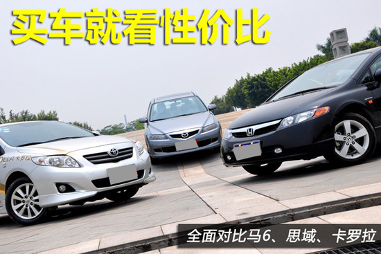 買車就看性價比!相信大部分消費者都是這樣想。何謂性價比,顧名思義就是性能、配置和空間等綜合起來之后與售價的比,便宜的不見得性價比一定高,貴的只要物有所值,同樣可以做到高性價比。今天我們來對比一下馬自達6、思域和卡羅拉3款車型,它們之間的差價并不大,僅為1萬元左右,屬于同價位車型,可以來個橫向對比。我們將從多個角度來對比這3款車型,看誰性價比最高。