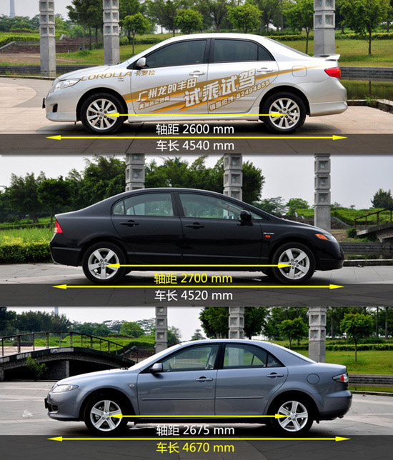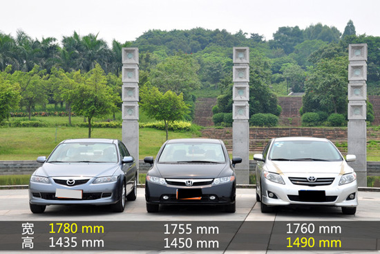 這3款車擺在一起,很有田忌賽馬的感覺。馬自達6定位是中高級車,但價格卻僅比主流的中級車貴1萬。由于定位不同,馬自達6擁有三車中最寬的車身尺寸,為1780mm。在高度對比中,卡羅拉最高,為1490mm。但在后面的對比中發(fā)現(xiàn),三車的頭部空間均為1拳,不相伯仲,打個平手。