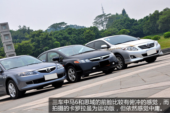 三車中馬自達6和思域的前臉比較扁平,更有俯沖的感覺。拍攝的卡羅拉雖為運動版,增加了前大包圍。但斯文人穿上球鞋后,本質依然,中庸。