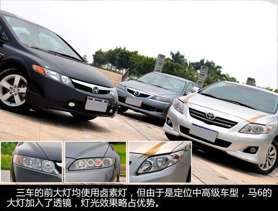 三車的前大燈均使用鹵素燈泡,豪華車上的氙氣大燈只能是夢想。但由于定位中高級車型,馬自達6的大燈加入了透鏡,燈光效果方面略占優(yōu)勢。