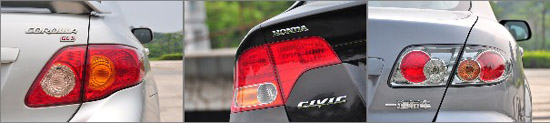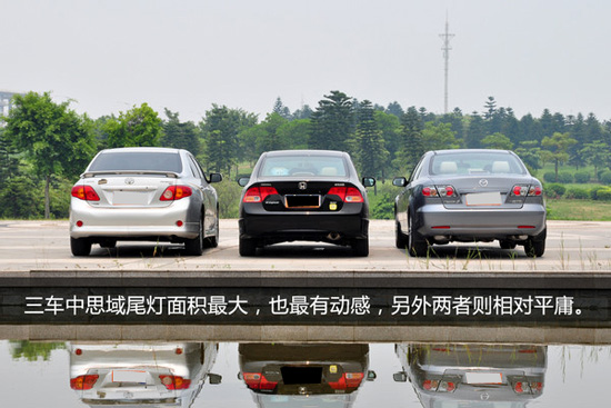 三車中思域尾燈面積最大,也最有動感,另外兩者則相對平庸。細心的朋友會看到,馬自達6的排氣管為雙出式,這讓發(fā)動機高速運轉時排氣更加暢順,表現(xiàn)自然更加出色。