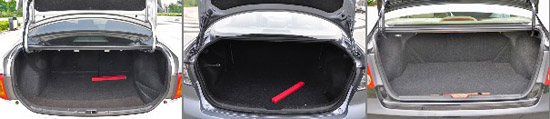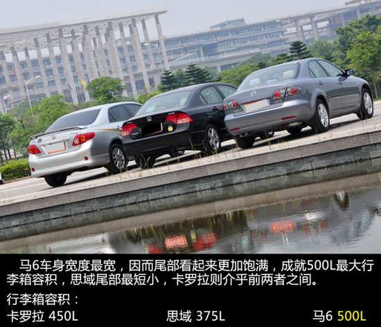 馬自達6車身最寬,因而尾部看起來更加飽滿,同時也成就了500L的行李箱容積,為三車之最。思域尾部最短小,行李箱只有375L,相當緊湊。卡羅拉則介于前兩者之間,行李箱容積為450升。三車行李箱地板都比較平整,方便行李的放置。