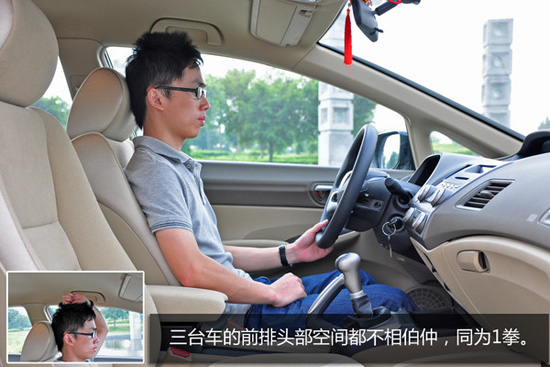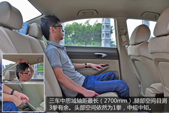 三車中思域軸距最長(zhǎng),為2700mm,腿部空間目測(cè)3拳有余,相對(duì)充裕。頭部空間依然為1拳,中規(guī)中矩。