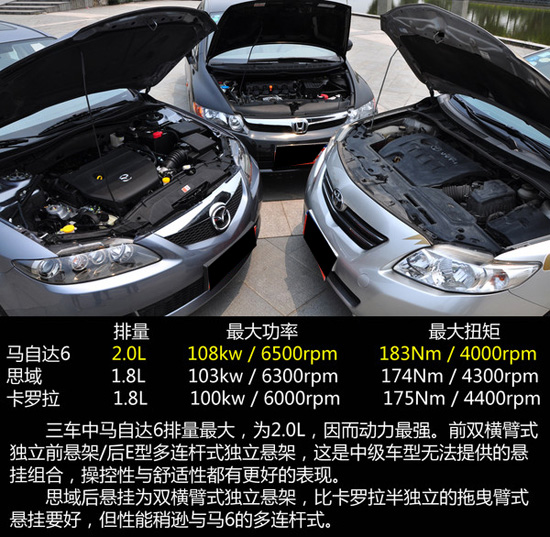 對(duì)比的這3款車,僅有馬自達(dá)6為真正的B級(jí)車,而思域及卡羅拉均為A級(jí)車,在同等價(jià)位上,馬自達(dá)6的競(jìng)爭(zhēng)優(yōu)勢(shì)明顯突出。