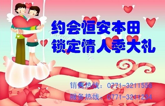 恒安本田精心為您準(zhǔn)備了節(jié)慶促銷大禮包。與最愛(ài)的人一起盡情享受浪漫情人節(jié)帶來(lái)的浪漫情懷。我們的宗旨就是讓每一位節(jié)日期間到店的顧客都充分感受到節(jié)日的濃郁氣氛: