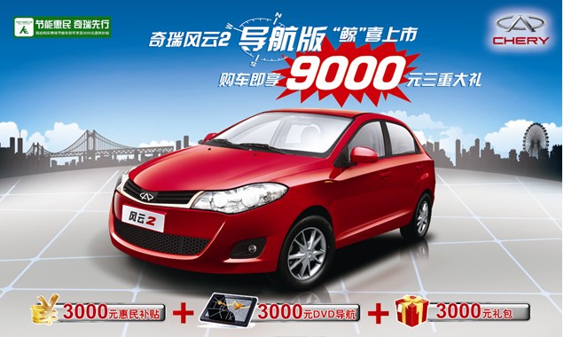 新年伊始,奇瑞風(fēng)云2再度重拳出擊。近日,記者從經(jīng)銷商處獲悉,風(fēng)云2導(dǎo)航版已隆重上市。新車上市期間,購車即可享受9000元三重大禮。