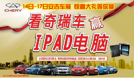 4月14日-17日,鑫廣達奇瑞500萬油卡大派送!車展期間交200預付金,即可參與看奇瑞車贏Ipad電腦活動;Ipad電腦、探路者燒烤爐,旅行背包,野外睡袋等,精美禮品,等您來拿! 100%中獎哦!