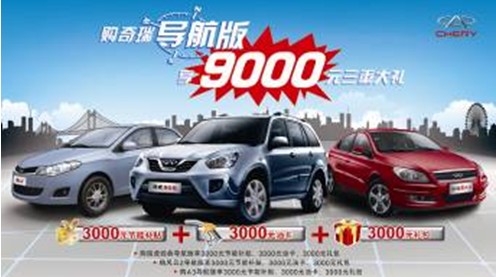 “陽(yáng)春布德澤,萬物生光輝!苯,記者在當(dāng)?shù)仄嫒鸾?jīng)銷商處了解到,目前奇瑞4S店正在開展奇瑞導(dǎo)航版促銷活動(dòng)。推出的導(dǎo)航版車型有瑞虎、奇瑞A3、風(fēng)云2三款不同級(jí)別車型供消費(fèi)者選擇,涵蓋SUV、緊湊型車、A0級(jí)車三種類型,裝備的智能導(dǎo)航集DVD、GPS、倒車影像、車載藍(lán)牙等多項(xiàng)高科技功能于一身。另外,凡在活動(dòng)期間購(gòu)買奇瑞導(dǎo)航版任意一款車型的消費(fèi)者,即可享受9000元三重大禮優(yōu)惠,包含3000元節(jié)能補(bǔ)貼+3000元油卡+3000元禮包,優(yōu)惠力度頗大。