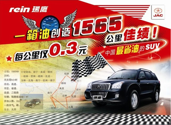 江淮瑞鷹一箱油挑戰(zhàn)活動于2011年5月9日凌晨2點32分結(jié)束;來自北流的陳冠金先生在加滿一箱油后挑戰(zhàn)成功,以1565公里的佳績獲得冠軍。這是一個非常好的成績,所以特擬在本周六舉行慶功會祝賀,并且同時舉辦總經(jīng)理簽售會,更多驚喜等著您哦!快快來參加吧!