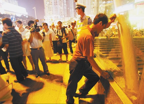 正當(dāng)記者在現(xiàn)場(chǎng)采訪拍攝時(shí),該男子竟怒視記者,威脅說:“信不信我把你的相機(jī)砸了!”他奮力沖向記者,所幸被身旁的民警控制住。