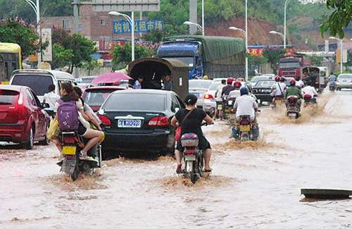 各種車輛在積水中涉水前行