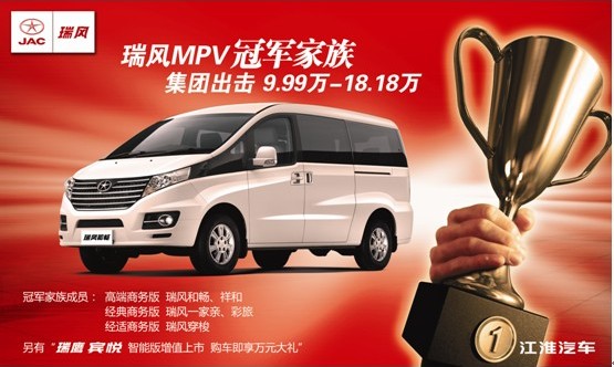 在金九銀十這個黃金銷售時期,瑞風MPV冠軍家族集團出擊,高端商務(wù)版瑞風和暢、瑞風祥和系列18.18萬—14.98萬,經(jīng)典商務(wù)版瑞風一家親、瑞風彩旅系列13.48萬—11.98萬,經(jīng)適商務(wù)版瑞風穿梭系列10.58萬—9.99萬,可靠的品質(zhì)、豐富的品種和健全的售后服務(wù),使得瑞風繼續(xù)穩(wěn)坐國內(nèi)MPV市場的冠軍寶座。