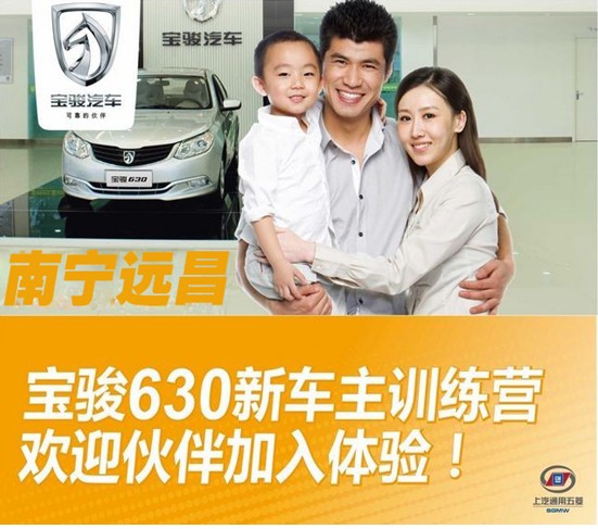 尊敬的寶駿車主:感謝您選用寶駿630!我們將于2011年11月26日上午10點(diǎn)30分,在南寧遠(yuǎn)昌寶駿4S店舉行“車主訓(xùn)練營”活動(dòng),屆時(shí)將有針對新購車主的專業(yè)汽車駕駛/維護(hù)/保養(yǎng)知識講座,及有趣的汽車競技游戲,幫助您更好用車,享受有車生活。我們誠邀您的光臨!凡到店參與寶駿630新車主訓(xùn)練營的車主,均可獲得價(jià)值200元/車的電話卡關(guān)懷禮品!并將參與三年六萬公里免費(fèi)保養(yǎng)抽獎(jiǎng)活動(dòng),更有千元驚喜大禮等著您!