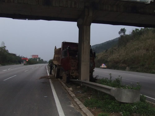 2011年12月9日早7時(shí),一名貨車司機(jī)因行車途中打起瞌睡,迷迷糊糊中導(dǎo)致車輛失控撞向高速公路立交橋墩上,造成車輛嚴(yán)重?fù)p壞,所幸人員無(wú)傷亡,事發(fā)泉南高速公路伶俐立交橋下路段。