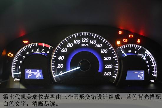 儀表盤(pán)采用三個(gè)圓弧形交錯(cuò)設(shè)計(jì),藍(lán)色背光搭配白色文字,清晰易讀。