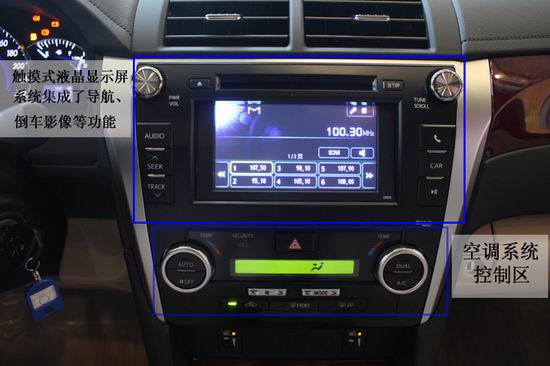 第七代凱美瑞(參數(shù)配置 圖庫(kù))中控臺(tái)最大的亮點(diǎn)在于這個(gè)大尺寸觸摸式液晶顯示屏,該系統(tǒng)集成了導(dǎo)航、倒車(chē)影像等多項(xiàng)功能。下面是空調(diào)系統(tǒng)控制區(qū)。