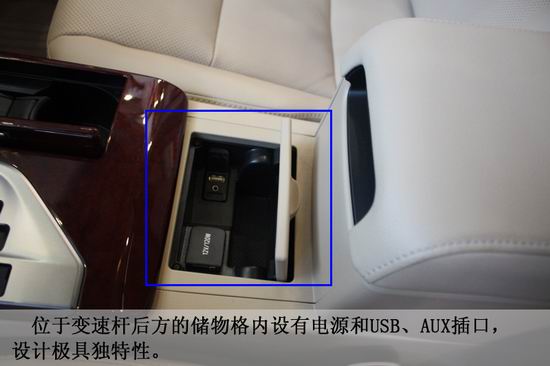 位于變速桿后方的儲(chǔ)物格內(nèi)設(shè)有電源和USB、AUX插口,設(shè)計(jì)極具獨(dú)特性。
