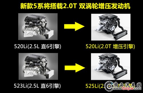 2013款寶馬5系車型較現(xiàn)款在動力總成上做出了改變,首先將現(xiàn)款搭載2.5L自然吸氣6缸發(fā)動機的520Li和523Li車型,分別更改為搭載2.0T雙渦輪增壓4缸發(fā)動機的520Li和525Li版本,在發(fā)動機做出改變后,525Li將替代現(xiàn)款523Li進入新款5系的產(chǎn)品系列中。此外從名稱上看,我們可以知道520Li的發(fā)動機數(shù)值和新三系320Li是相同的,而525Li的發(fā)動機會小于328Li的調(diào)教數(shù)值。