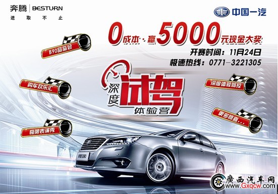 廣西鉅榮一汽奔騰將于11月24日在廣西體育中心舉行奔騰B90深度試駕活動(dòng),即日起鉅榮奔騰將開展系列精彩活動(dòng)等您來挑戰(zhàn)!