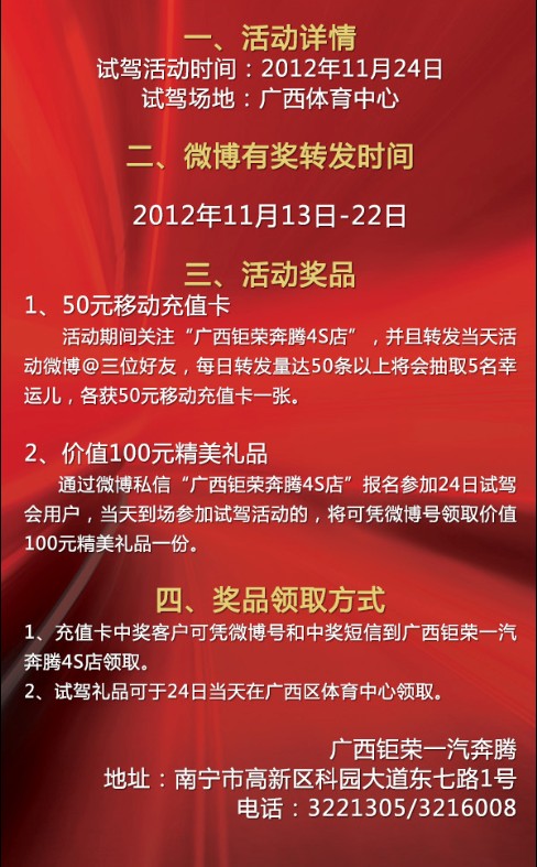 1、關(guān)注“廣西鉅榮奔騰4S店”官方微博,轉(zhuǎn)發(fā)活動(dòng)微博并@三位以上好友,每天抽出5名博友各獲得50元移動(dòng)充值卡一張。
