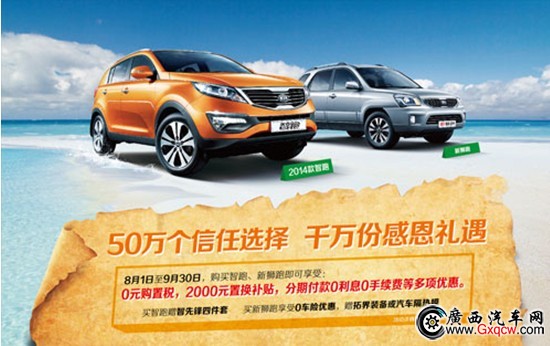 今年是東風悅達起亞的“顧客感動年”,恰逢企業(yè)SUV車型累計銷售突破50萬臺之際,東風悅達起亞攜2014款智跑和新獅跑兩款新車型,開展“50萬個信任選擇 千萬份感恩禮遇”活動回饋廣大消費者。8月1日到9月30日,購買智跑的客戶可獲贈智跑先鋒四件套,購買新獅跑的客戶則可在享受0車險優(yōu)惠的同時獲贈拓界裝備或者汽車隔熱膜。更為貼心的是,響應東風悅達起亞“用戶至上”的服務理念,購買智跑和新獅跑還可享受:0元購置稅,2000元置換補貼,分期付款0利息0手續(xù)費等多項優(yōu)惠。詳詢東風悅達起亞廣西通惠,24小時熱線:0771-2244 666,地址:南寧市白沙大道69號。