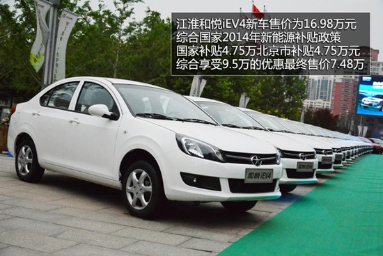 2014年7月15日,江淮第四代純電動(dòng)家轎-和悅iEV4在北京正式上市。售價(jià)為16.98萬(wàn)元,享受政府補(bǔ)貼后售價(jià)僅為7.48萬(wàn)元,成為了京城在售最便宜的純電動(dòng)轎車之一。江淮和悅iEV4繼今年2月底在上海宣布正式上市后,此次全面登陸北京私人用車市場(chǎng)。江淮和悅iEV4在充滿電情況下,廠商公布的60km/h勻速續(xù)航里程約為200公里,綜合工況的續(xù)航里程約160公里,百公里耗電為13kWh(度).......