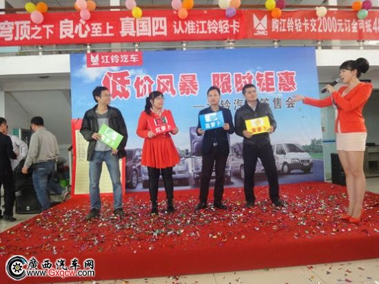 3月28日周六上午廣西江鈴汽車在4S 店內(nèi)舉行江鈴汽車各車系簽單會(huì),并推出開春超值促銷優(yōu)惠,吸引來江鈴眾多新老客戶朋友的關(guān)注。同時(shí),當(dāng)天活動(dòng)現(xiàn)場(chǎng)江鈴伙伴為客戶朋友們精心準(zhǔn)備各種互動(dòng)環(huán)節(jié)也深受在場(chǎng)客戶朋友的喜愛,然而,面對(duì)誘人的優(yōu)惠政策來參與活動(dòng)的朋友也是紛紛在訂車榜上簽訂車信息。*后,簽單會(huì)以較好的訂單量取得圓滿成功。