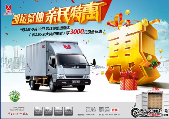 據(jù)獲悉,截止9月30日到廣西江鈴安吉4S店購江鈴凱運寬體即享交2000元訂車款抵5000元購車款,機會難得,歡迎感興趣的朋友到店選購。咨詢熱線:0771-3119811.