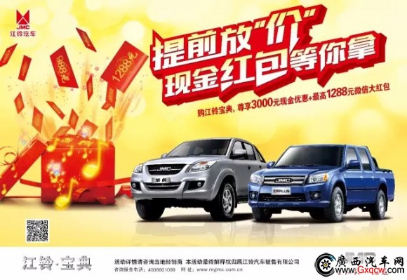 江鈴寶典提前放“價(jià)”,截止11月30日到廣西云匯汽車(chē)白沙4S店購(gòu)江鈴寶典系列車(chē)型均可享受現(xiàn)金讓利3000元再加微信抽紅包,微信紅包*高可達(dá)1288元抽取金額可直接抵扣車(chē)款。欲購(gòu)車(chē)的朋友趕快到店選購(gòu)吧!咨詢熱線:0771-3800599.