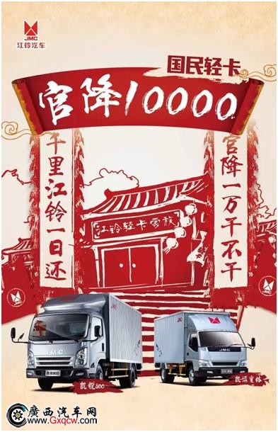 獨(dú)樂(lè)樂(lè)不如眾樂(lè)樂(lè),新年新驚喜,江鈴輕卡重磅級(jí)的福利降臨,即日起至1月31日購(gòu)江鈴輕卡凱銳N800車型即可享受現(xiàn)金直降10000元,歡迎廣大朋友來(lái)店咨詢搶購(gòu)。咨詢熱線:0771-3119811.