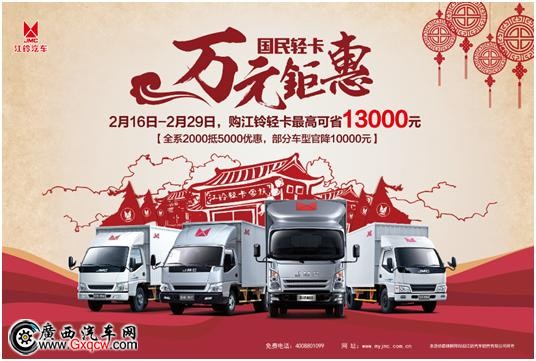 據(jù)獲悉,即日起至2016年2月29日到廣西江鈴安吉4S店購(gòu)江鈴輕卡任意車系即可享預(yù)交2000元定金抵5000元購(gòu)車款,限時(shí)鉅惠,機(jī)會(huì)難得,欲購(gòu)車的廣大朋友快快到店咨詢了解吧!咨詢熱線:0771-3119811.