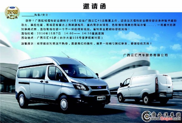 據(jù)悉,9月21日,宣布正式上市的福特新全順剛一亮相,售價(jià)11.93萬起的福特新全順,越世登場!廣西云匯4S店新車上市發(fā)布會于10月7日在店內(nèi)舉行,活動(dòng)期間更有您意想不到的優(yōu)惠哦!同時(shí)現(xiàn)場更有上海灘旗袍風(fēng),等室內(nèi)游戲等您來挑戰(zhàn)觀摩,我們在廣西云匯4s店期待您的光臨,咨詢熱線:0771-3800599!