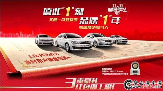 現(xiàn)在只要進入“添”貓東風雪鐵龍官方旗艦店首頁(“添”貓搜索:東風雪鐵龍官方旗艦店),就能參與翻寶紅包,每天100元-10000元不等!每天都有機會抽取,無底線免費派發(fā),不抽到你都不好意思!還有,參與1元試駕活動,即送100元紅包!更有機會抽取炙手可熱的iPhone 6!還有還有!同時前往“薪”浪汽車雙11會場,參與東風雪鐵龍預付購車,*高還能有4999元現(xiàn)金返現(xiàn)!最重要的是,東風雪鐵龍全系車型都支持紅包使用!所以,空前絕后的紅包,你還不快來搶!(點擊:http://citroen.tmall.com/)