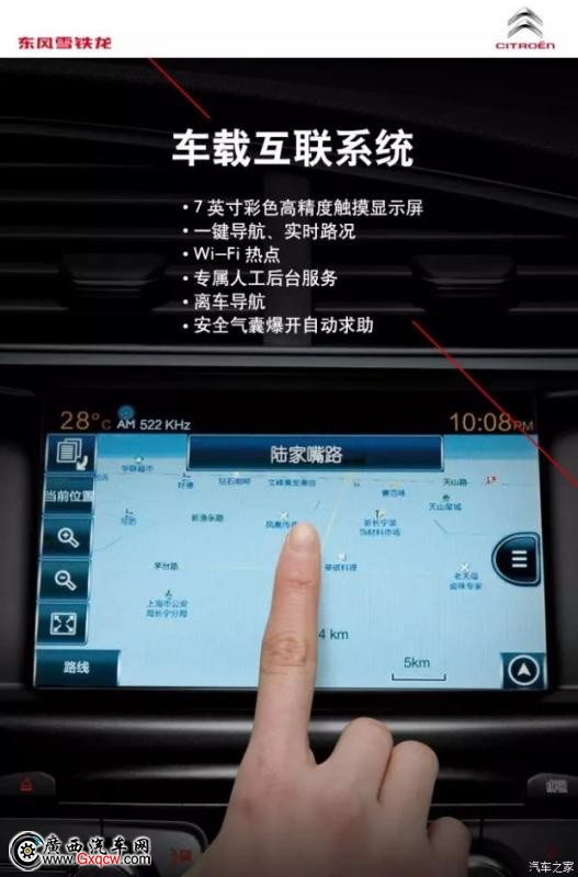 *后,新C4L搭載了Citroen Connect車載互聯(lián)系統(tǒng),該系統(tǒng)集導航、安全保障、互聯(lián)分享、資訊、無憂養(yǎng)車五大模塊于一體,配有導航、實時交通信息、安全氣囊起爆后自動求助、車況檢測月報、WIFI熱點等多達21項子功能~你和Ta在一起,他不僅保護你,更能根據(jù)你的想法,主動為你著想,絕不讓你有絲毫的不安。