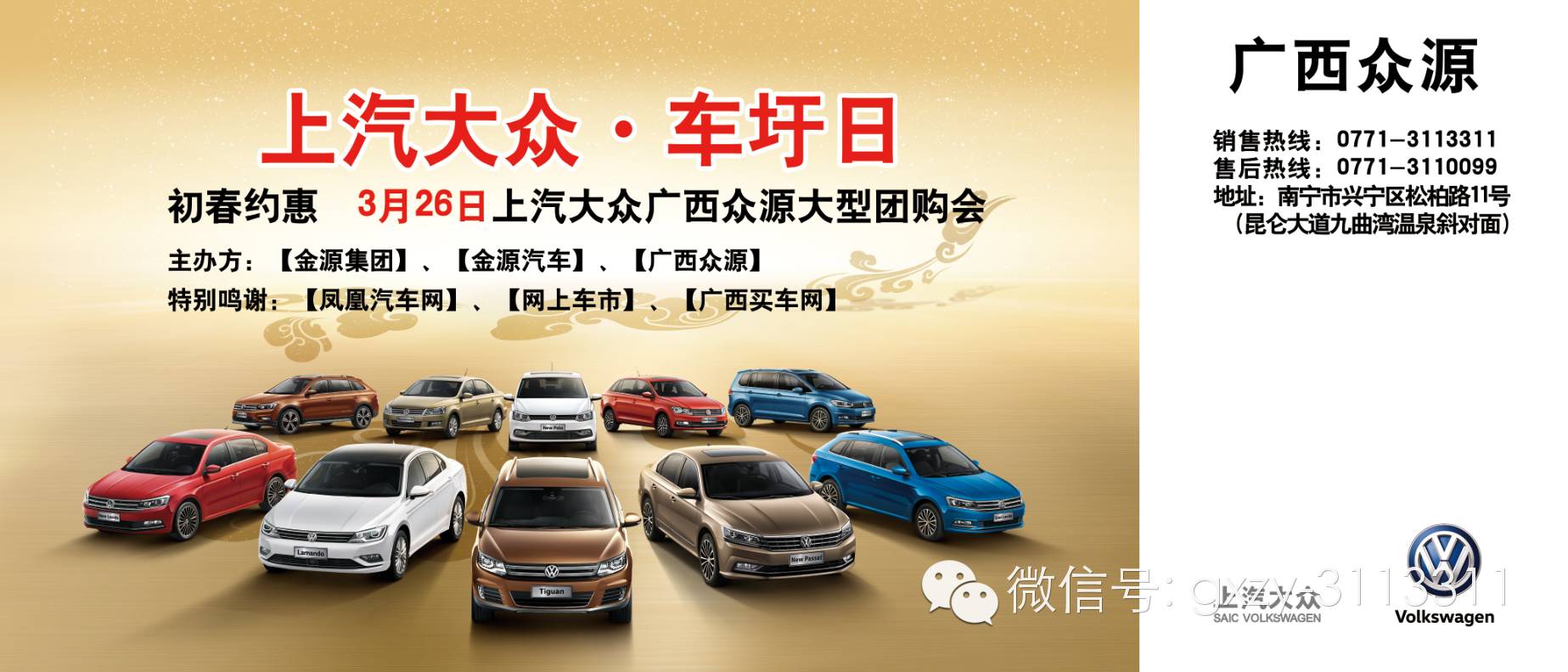 上汽大眾.車圩日——初春約惠,上汽大眾廣西眾源大型團(tuán)購(gòu)會(huì),給您不一樣的答案!3月26日14:00,全系價(jià)格現(xiàn)場(chǎng)公布,敬請(qǐng)拭目以待!活動(dòng)報(bào)名熱線:0771-3113311