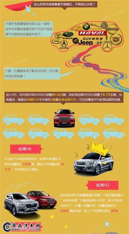 SUV市場已經(jīng)從“紅海”向“深紅”演變,但哈弗品牌繼續(xù)保持強勁的增長勢頭。9月份哈弗銷售87627輛,同比勁增59.39%;前9月累計銷售590330輛,同比增長23.23%,毫無懸念地穩(wěn)坐SUV銷量冠軍寶座。