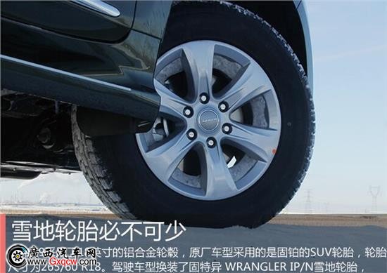 哈弗H9采用了18英寸的鋁合金輪轂,原廠車型采用的是固鉑的SUV輪胎,輪胎尺寸為265/60 R18。我駕駛的車型換裝了適用于冰雪路面的固特異WRANGLER IP/N雪地輪胎,細(xì)密獨(dú)特的胎紋讓車輪與路面牢牢咬合,提供更加優(yōu)異的抓地力。