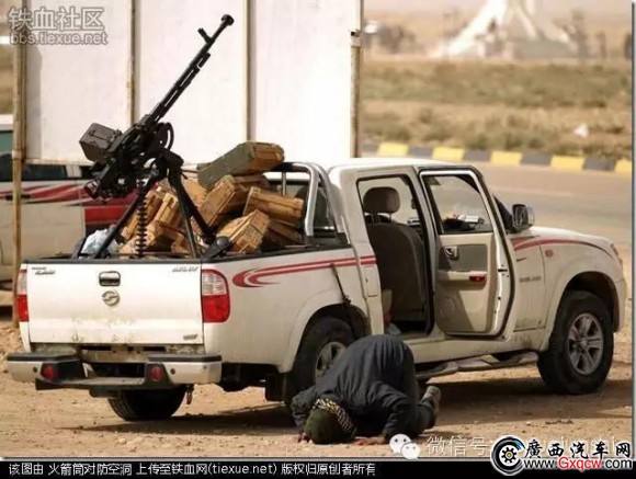 這就是在車(chē)斗上加裝了機(jī)槍的中國(guó)皮卡,而且還在后面裝了好幾箱的彈藥。