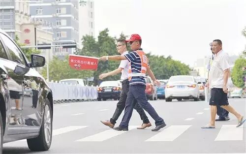 志愿者提醒車輛禮讓斑馬線,引導(dǎo)行人過(guò)馬路↑↑