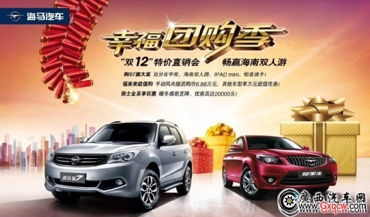 在幸福團(tuán)購(gòu)季進(jìn)行期間,訂購(gòu)海馬S7,即有機(jī)會(huì)獲得價(jià)值8000元的海南島雙人游,此外還有IPAD mini、千元加油卡等您來(lái)拿,一個(gè)人的旅行,不如兩個(gè)人的浪漫,假如您向往冬日海島的溫馨時(shí)刻,并且也對(duì)海馬S7觀(guān)望已久,不妨抓住這次難得的機(jī)會(huì)!