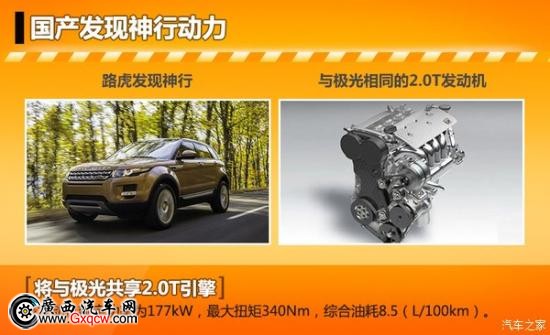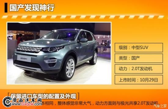 繼奇瑞捷豹路虎推出首款路虎 品牌國產車型攬勝極光后,在9月份成都車展上首次亮相的第二款國產車型發(fā)現(xiàn)神行得到了廣泛關注。國產發(fā)現(xiàn)神行在外觀造型上與進 口版本保持一致,并搭載一臺2.0T渦輪增壓發(fā)動機。今日,網通社從奇瑞捷豹路虎汽車官方獲悉:路虎第二款國產車型發(fā)現(xiàn)神行將于今日正式上市。該車是豪華 中型SUV細分領域中,首款采用7座布局的車型,新車預售價40萬元起,上市后將與極光形成全新的“組合拳”。