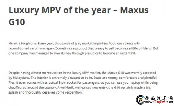 就在當(dāng)天,大通MAXUS G10力壓眾多歐系、日系**知名品牌,在馬拉西亞權(quán)威汽車數(shù)字媒體舉辦的2017年度最亻圭車型頒獎盛典中斬獲了“2017年最亻圭豪華MPV車型”(是不是很厲害,撒花~)