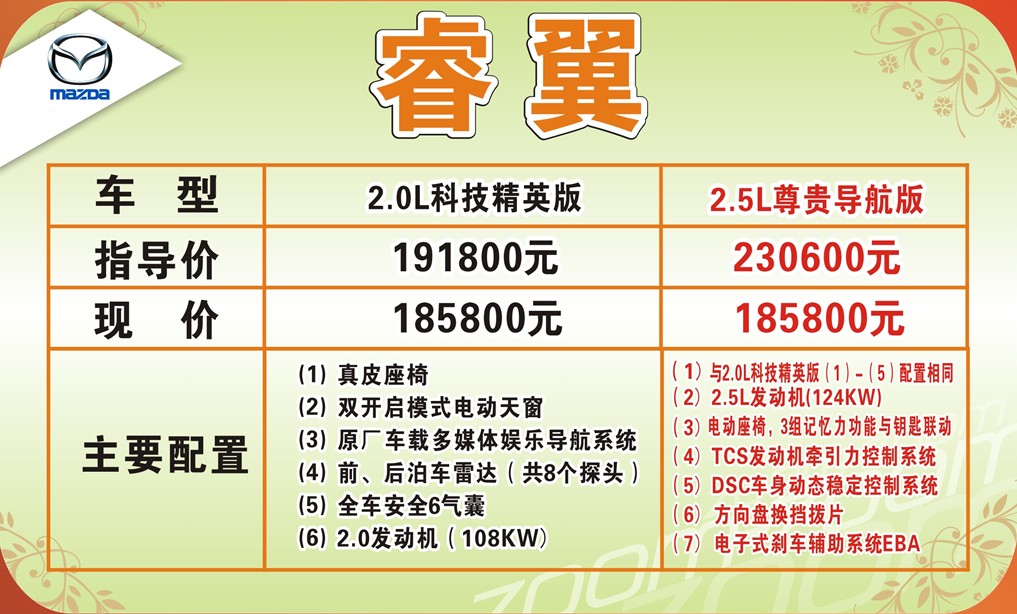 4、購(gòu)馬自達(dá)6、睿翼尊享0利息、0手續(xù)費(fèi);