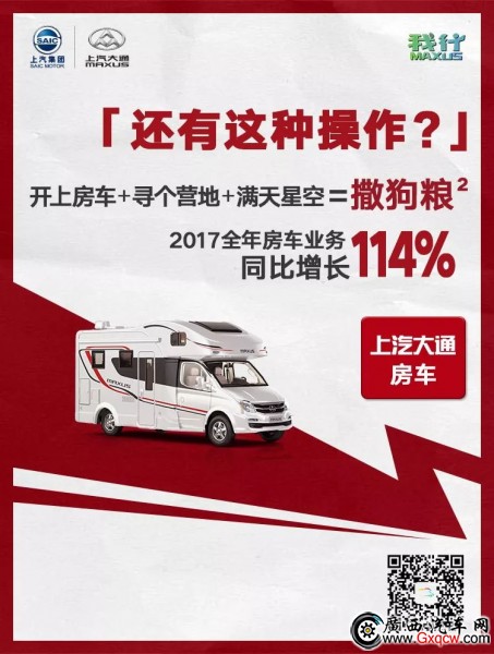 在房車生活領(lǐng)域,上汽大通房車業(yè)務(wù)同比增長114%。截止至2017年年底,上汽大通已經(jīng)形成了較為全面的房車產(chǎn)品布局,旗下產(chǎn)品不僅包括RV80 B型房車和C型房車,同時(shí)還有營地拖掛房車RT11。同時(shí),集房車租賃、營地預(yù)定、房車旅行、攻略游記、共享房車等功能的房車旅行一站式服務(wù)平臺的“房車生活家”,更是讓房車觸手可及。開上房車、尋個(gè)營地,再配上滿天星空,2018年撒狗糧的新姿勢,你有沒有g(shù)et到?